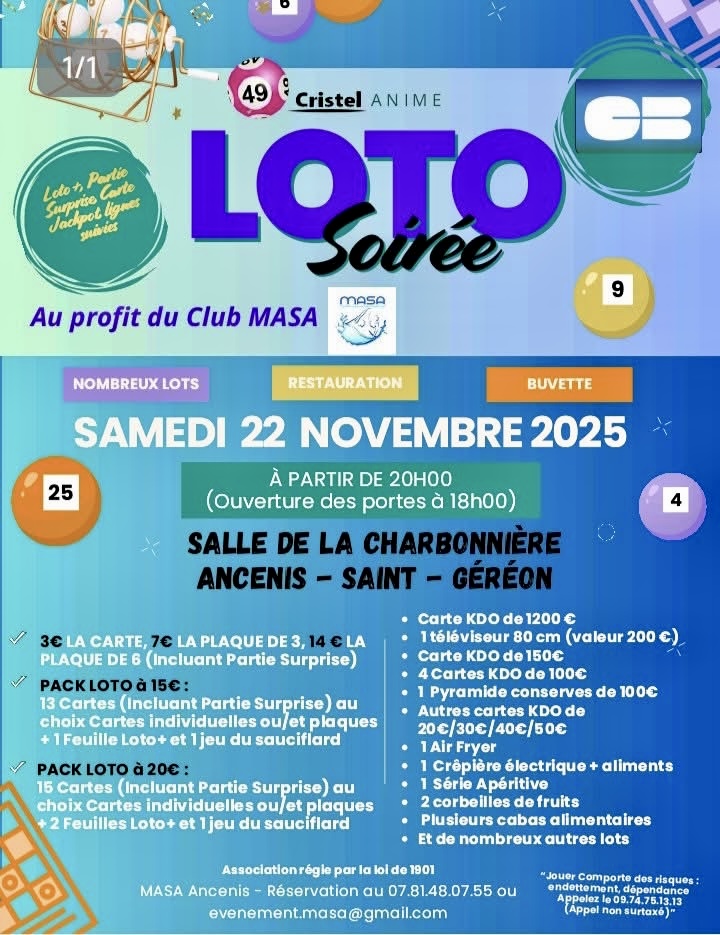 Le club de natation artistique du MASA d’Ancenis vous donne rendez-vous pour sa grande soirée loto le vendredi 22 novembre à 20h, à la salle de la Charbonnière à Ancenis.